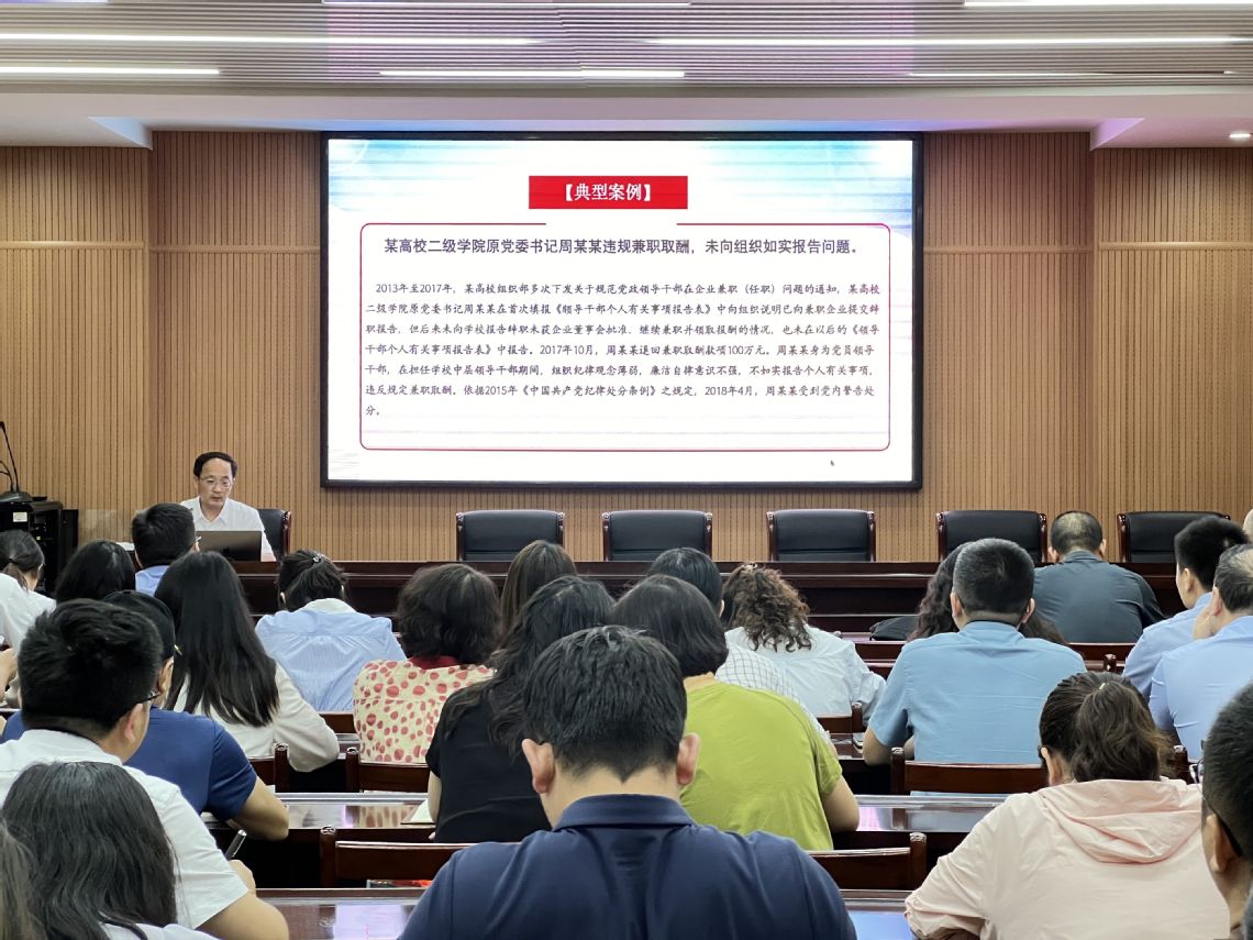 新闻网讯(通讯员黄思雨 摄影黄国伟)在全面从严治党的时代背景下,为深入学习贯彻党的纪律规矩,进一步加强高校党风廉政建设,6月27日下午,副校长杨旭东在凌曦楼B2002会议室为分管单位党员讲授以“贯彻落实新修订《条例》 推动学校高质量发展”为主题的党纪学习教育专题党课。合作发展处、教务处、质量管理处、科研与技术服务处、信息化办公室、麻城校区管委会、人工智能学院、生物工程学院等单位党员共计50余人参加学习。