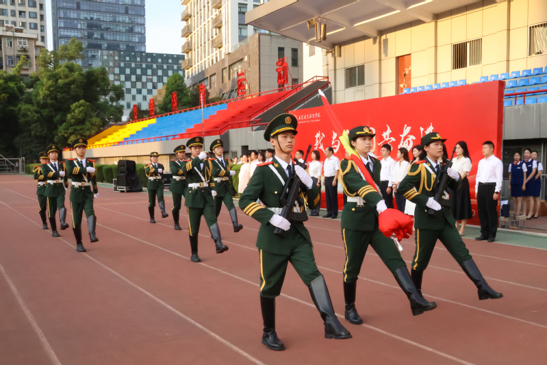 早上6:50,国旗护卫队迎着朝阳,昂首挺立,步履铿锵,护卫五星红旗走向升旗台。伴随庄严神圣的《义勇军进行曲》,五星红旗冉冉升起,在熠熠晨光中迎风飘扬。全体师生满怀对祖国的无限热爱和崇高敬意,面向国旗行注目礼,现场庄严肃穆。